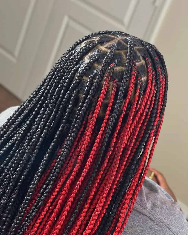 Braids beautifully highlight black hair with red underneath, showcasing the peekaboo color in an intriguing, woven pattern. Whether you choose classic braids, box braids, or a chic fishtail style, your hidden red color emerges in flashes, adding intrigue to your everyday look.