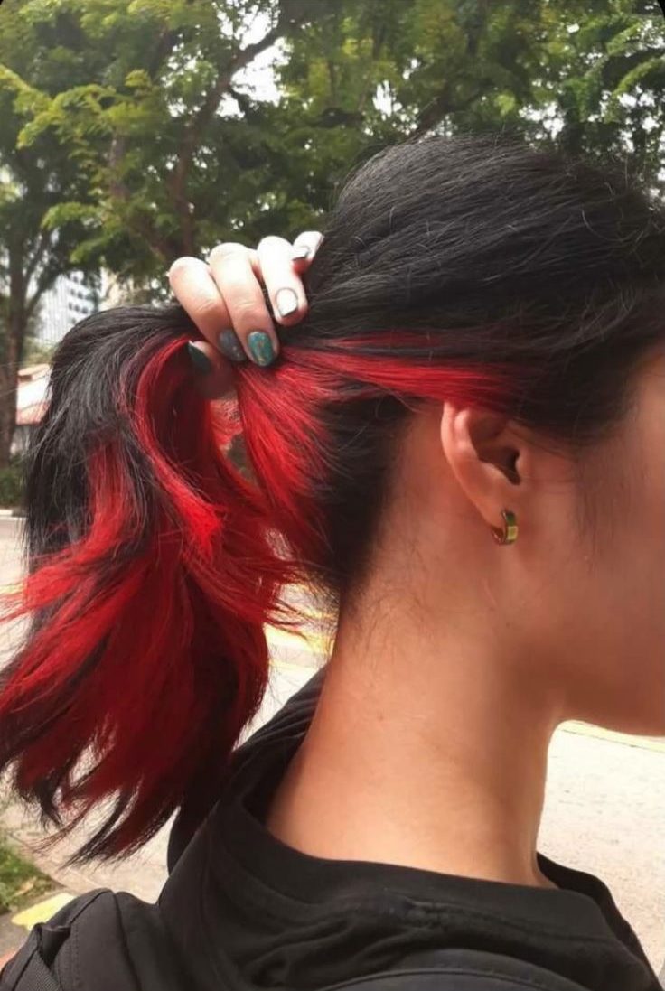 Starting off strong, sleek, straight black hair combined with a fiery red underlayer is an attention-grabbing combo that’s bold yet classy. The vibrant red beneath the glossy black gives you that extra pop of color whenever you flip or tuck your hair behind your ear. It’s a favorite among fashion enthusiasts embracing bold hair colors, providing an eye-catching look that effortlessly blends into any style or event.