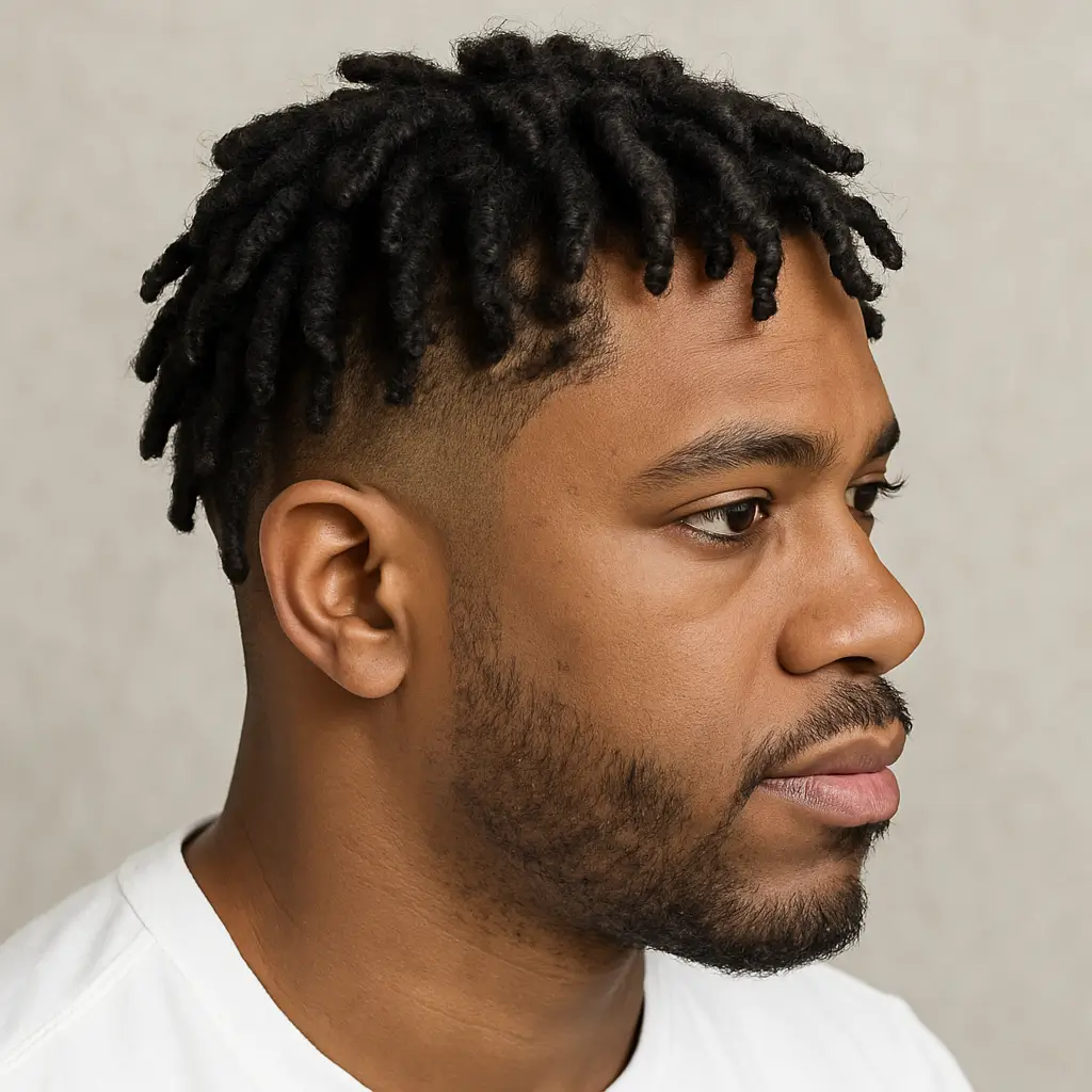 It’s one of the more striking Black men hairstyles in 2025, often seen with temple fade or burst fade variations for added style. Regular maintenance is key to keep the fade sharp and the locs healthy.