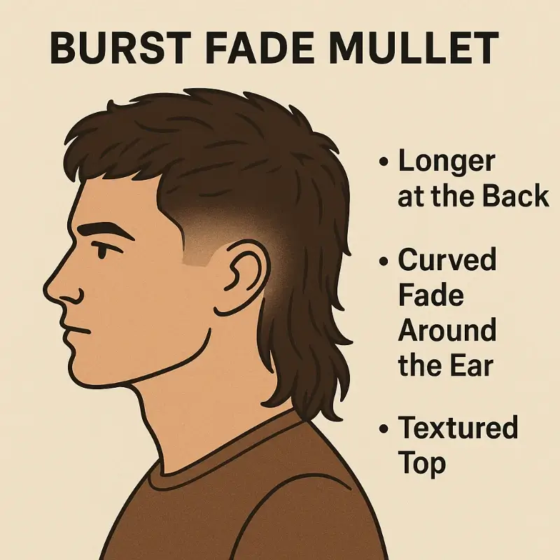 This hybrid combines the mullet’s iconic shape with the burst fade’s modern technique. The result? A haircut that looks edgy, clean, and surprisingly wearable.