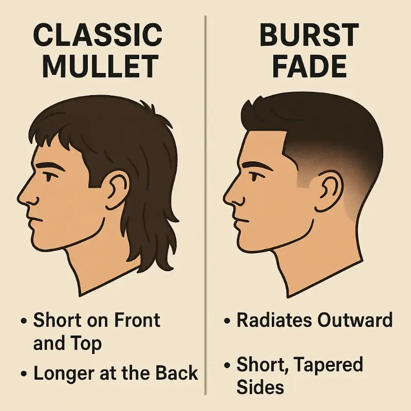 Here’s where most people get mixed up — the mullet and the burst fade aren’t rivals; they belong to different haircut categories altogether.
