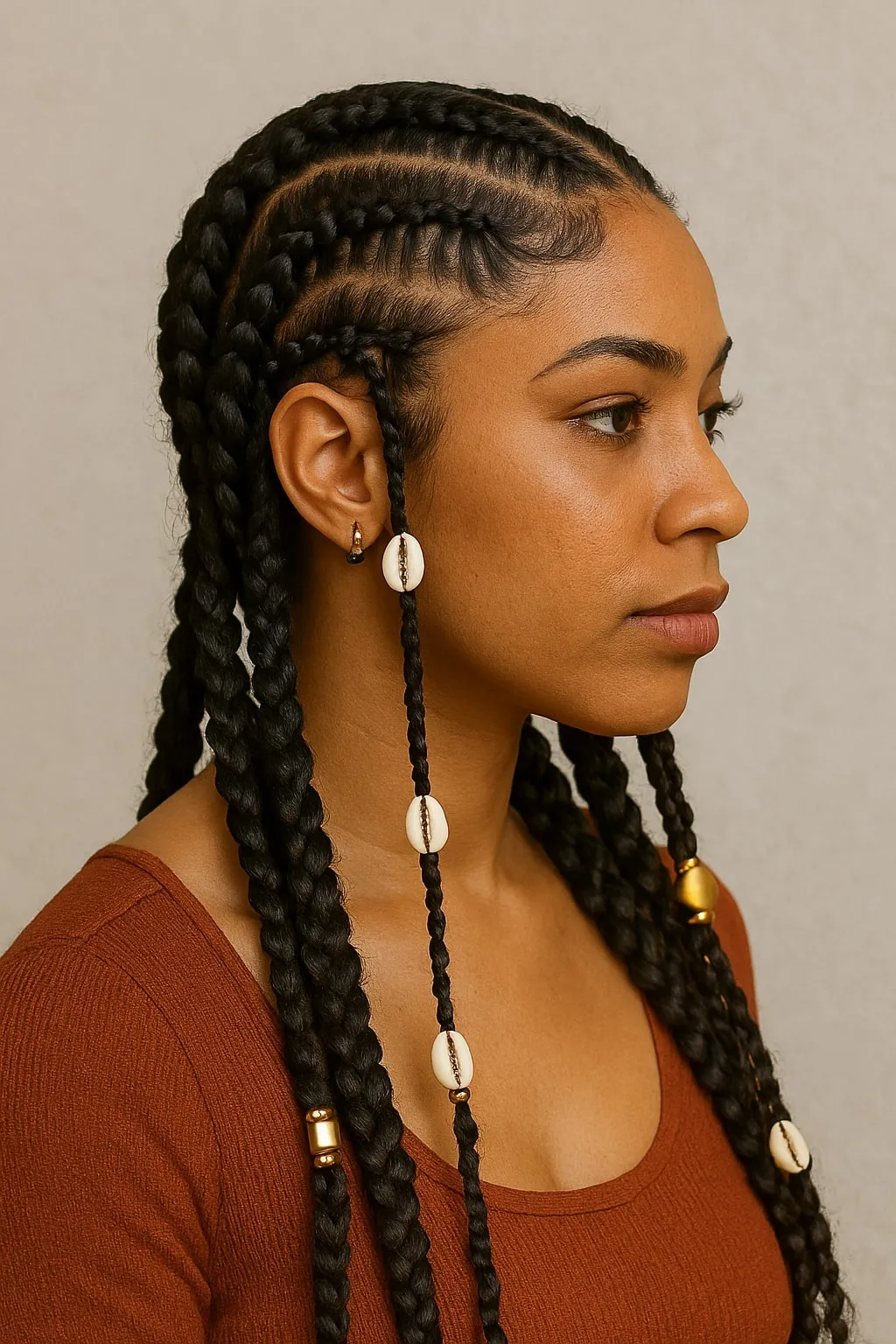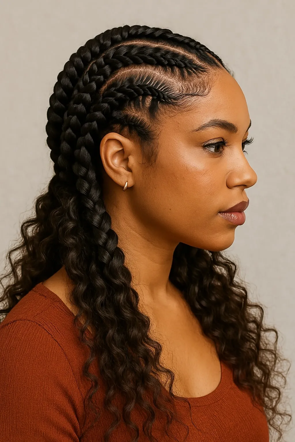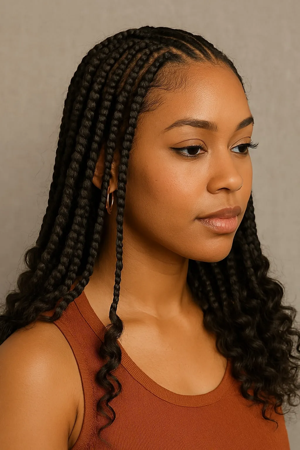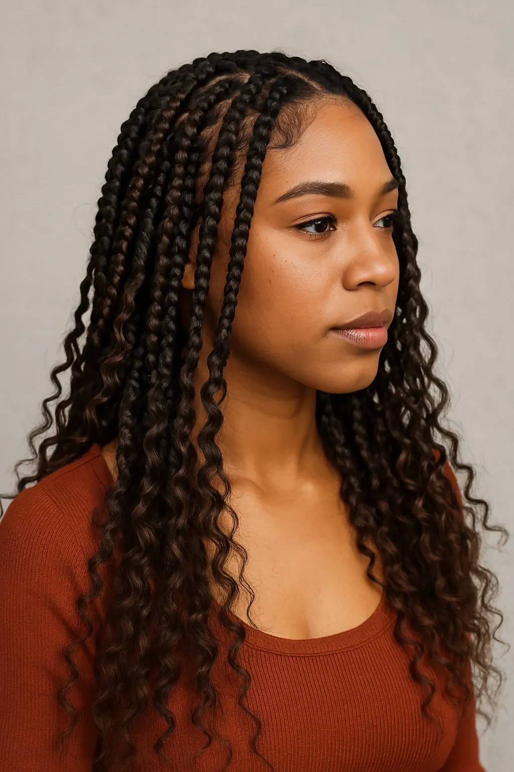 Goddess braids are an elegant, eye-catching version of knotless box braids. This style involves adding loose curls throughout the braids, creating a luxurious and flowing look. Goddess braids offer exceptional styling versatility, allowing you to wear them casually or elegantly. Enhance this look further with hair accessories like gold cuffs or delicate beads for a regal finish.
