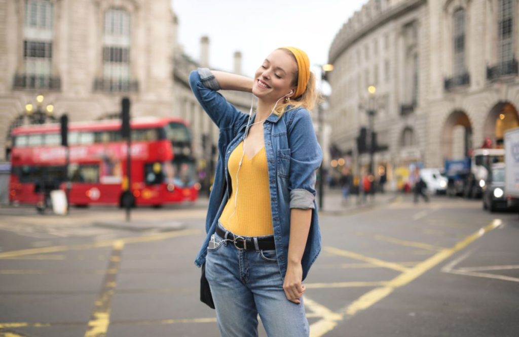 Chunky loafers, platform sneakers, or cowboy boots? Absolutely. London’s fashion energy thrives in the unexpected. Add a claw clip or headband to tie the look together, and don’t shy away from a bold bag — a neon shoulder purse or animal print clutch adds a whole vibe.