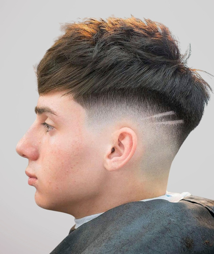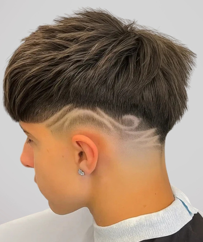 This version stands out thanks to custom barber designs shaved into the faded sides. The top stays layered and voluminous, giving balance to the bold detail on the sides. Use molding paste to shape the top and enhance texture. Best for guys who like creative, eye-catching cuts.