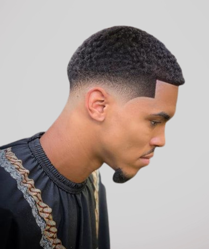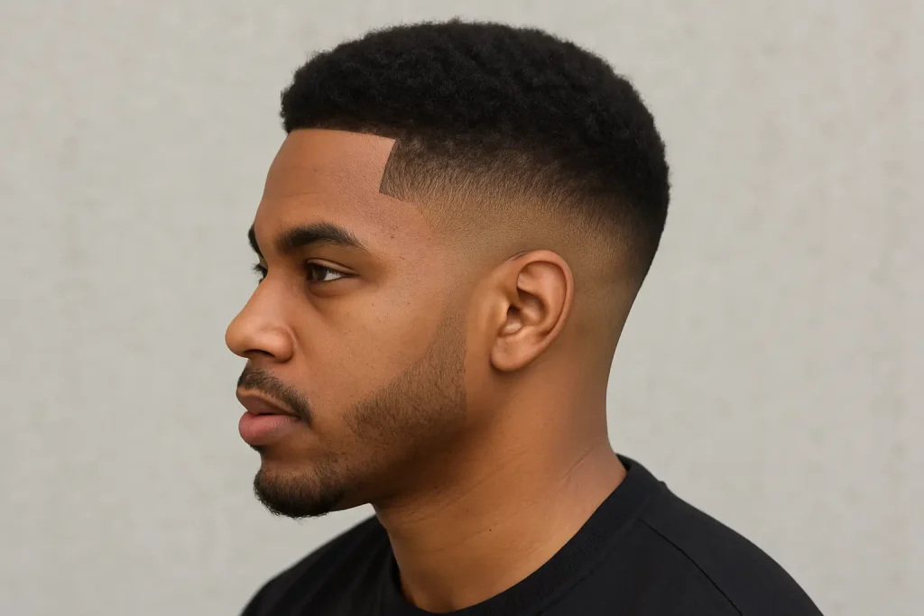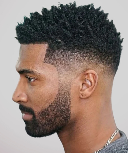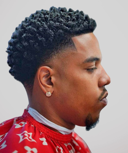 Sharp and structured, this cut is designed for Black men with natural curls or coils. The taper begins at the temples and blends smoothly into defined edges, while the top stays full and textured. A line-up at the hairline keeps everything crisp, making it perfect for oval, square, or diamond face shapes. To keep coils healthy and defined, use a lightweight styling cream and diffuse on low heat.