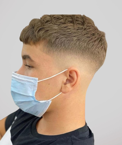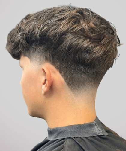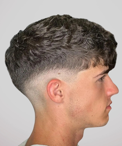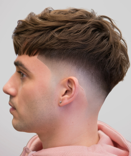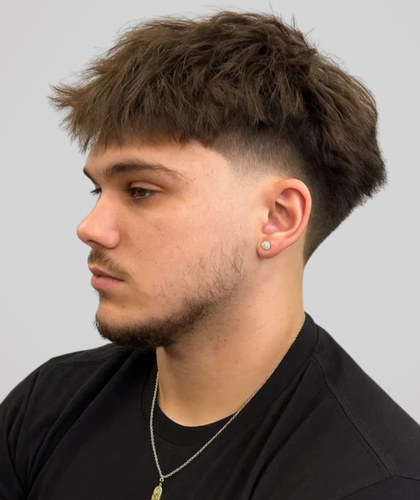 For men who like a slightly messy but structured look, this cut pairs a low-maintenance taper with a choppy, layered fringe. The fringe adds movement and casual edge, while the fade keeps everything sharp. Texture powder or matte clay works best to style this haircut. Great for straight to wavy hair types.