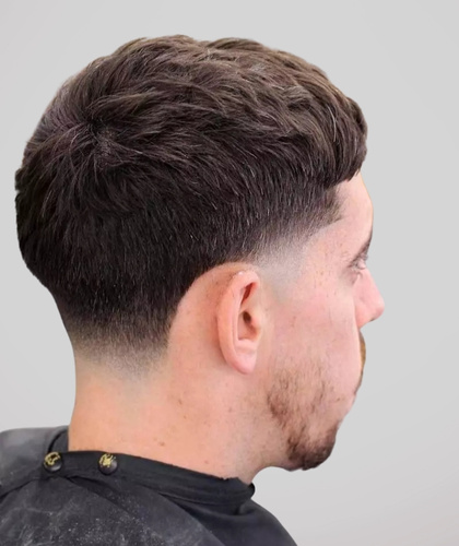 This version keeps the top short and thick with a subtle, textured finish. The fade starts mid-side for structure without being too sharp. A matte cream gives natural control, while blow-drying adds soft lift. Works best for oval and square face shapes.