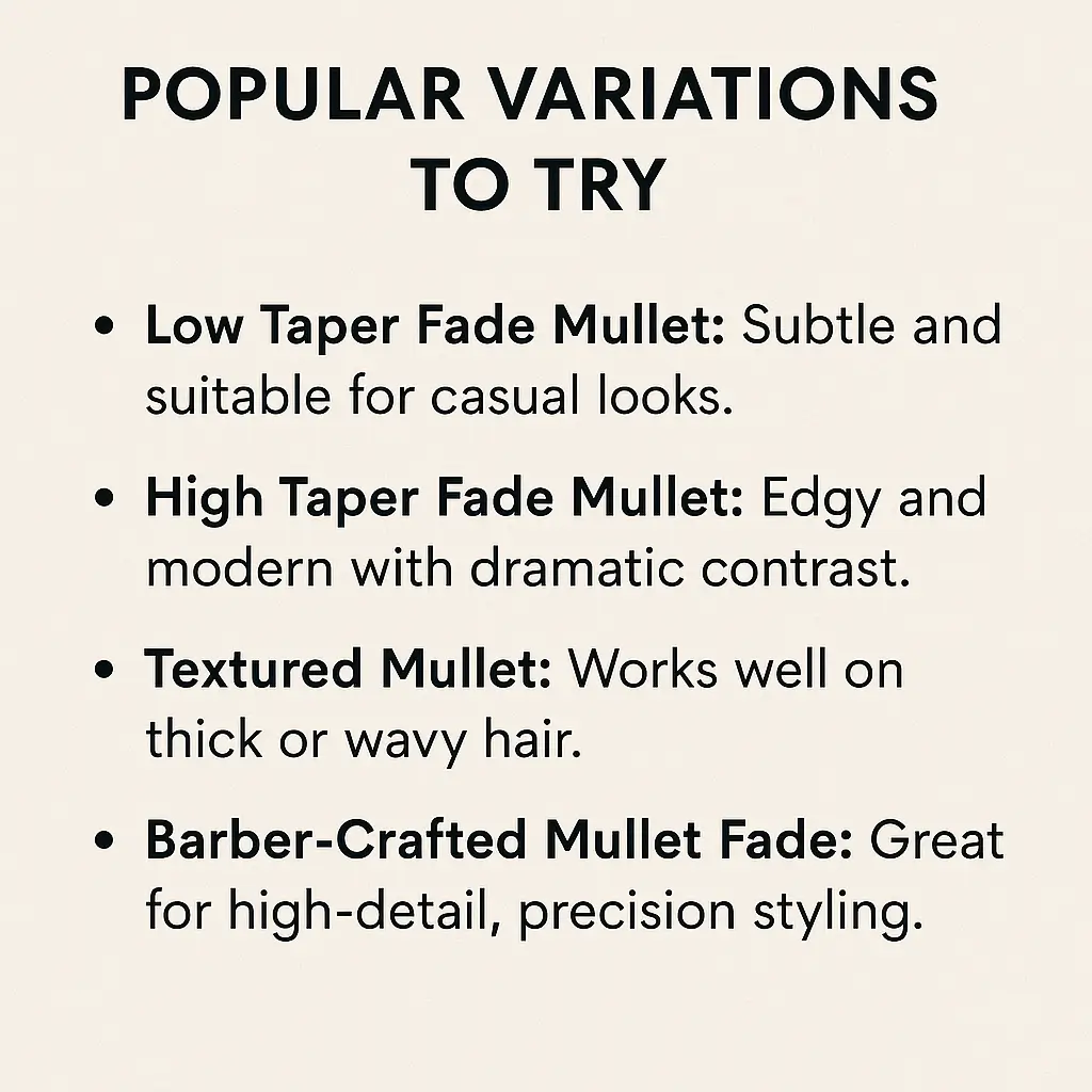- Low Taper Fade Mullet: Subtle and suitable for casual looks.